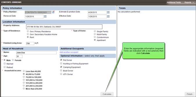 - Click Create Valuation. Enter or select the information on the dialog. Required information is indicated with a red asterisk. Household income may or may not be required depending on your configuration settings. The household income field may not appear on this dialog if it is not enabled. When adding additional occupants enter a range for age between 1 and 150. For infants under one year of age, use 1 year.