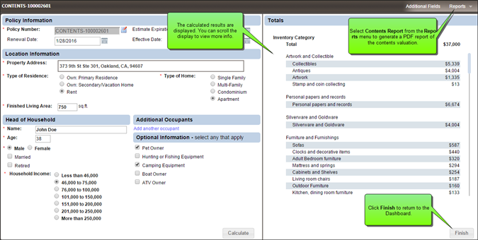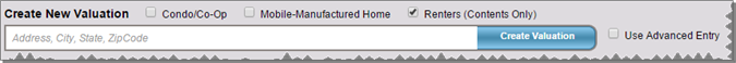 - In the Create New Valuation field enter the address including the ZIP code. Select the Renters (Contents Only) check box.
