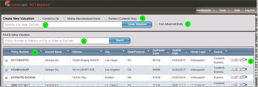Use the main dashboard to begin new valuations. You can also view a list of existing valuations, search for valuations, preview valuation information, download reports, and more.