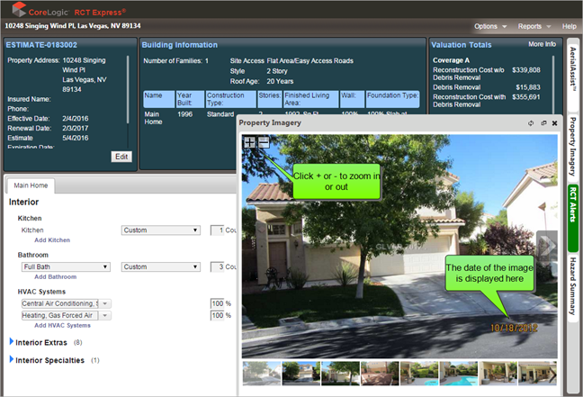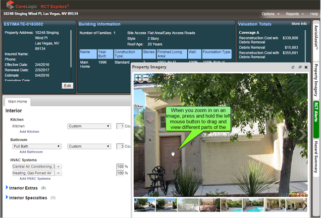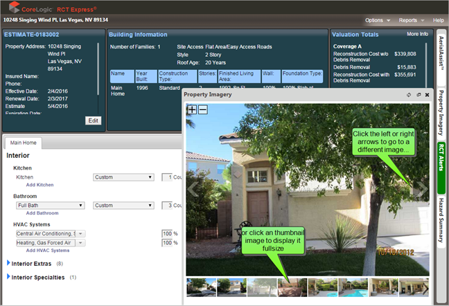 The Property Imagery tab on the valuation screen displays the available photos of the property, both exterior and interior.
