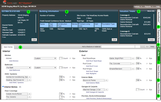 The Valuation page consists of different panels that provide policy information, building information, valuation totals, and information about materials.
