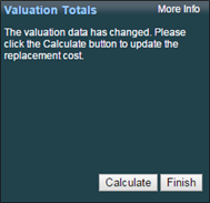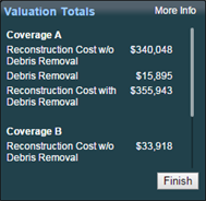 The Valuation Totals panel displays a summary of the replacement cost information calculation and, if configured, the contents valuation.