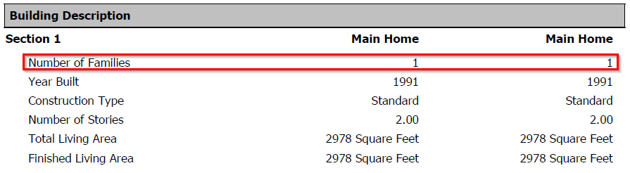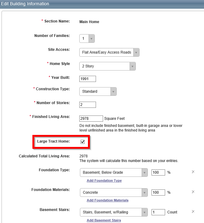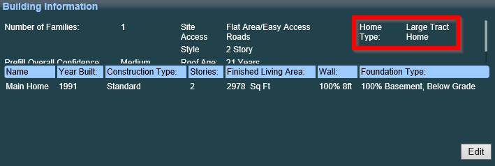 CoreLogic designates whether or not a property is considered a Large Tract Home. If a property is considered a Large Tract Home, there will be visual indicators of this designation and users will have the ability to opt out of this designation and return the property to standard assumptions and materials if desired.