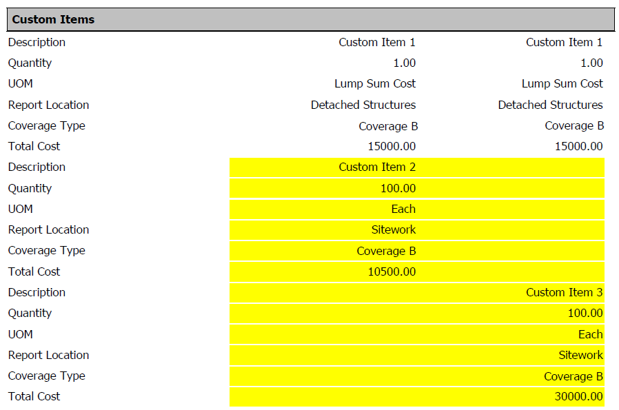 Custom Items with a category of Detached Structures and set to Coverage Type A now are accurately represented in totals for Coverage A. Previously, any Custom Items set like this were not factoring into Coverage A totals.