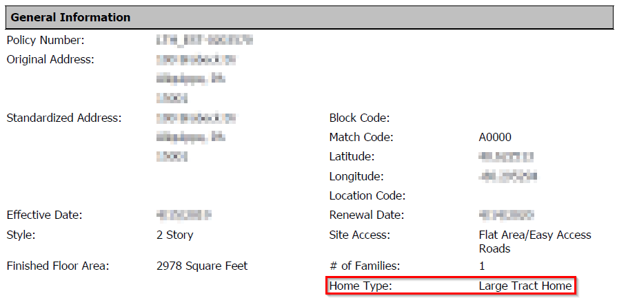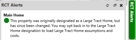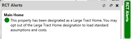 When a property is found to be a Large Tract Home, a label will appear on the Building Information Panel and an informational message will display on the RCT Alerts slider panel.