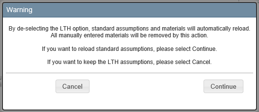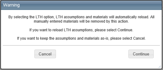 Users may opt out of the system-defined Large Tract Home designation for a property by unchecking the LTH checkbox found within the Building Information Panel. This will automatically reload standard assumptions and materials for the property.